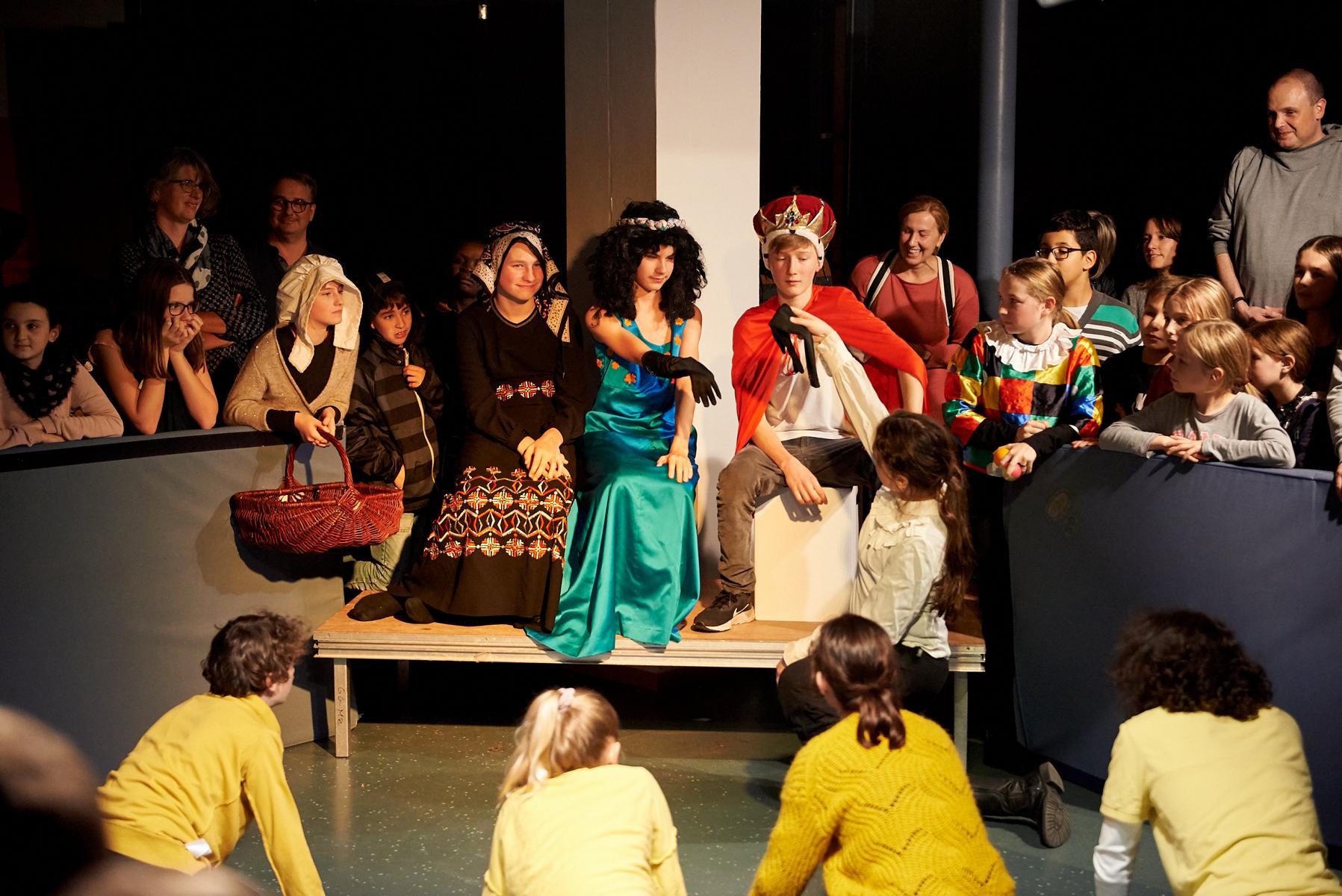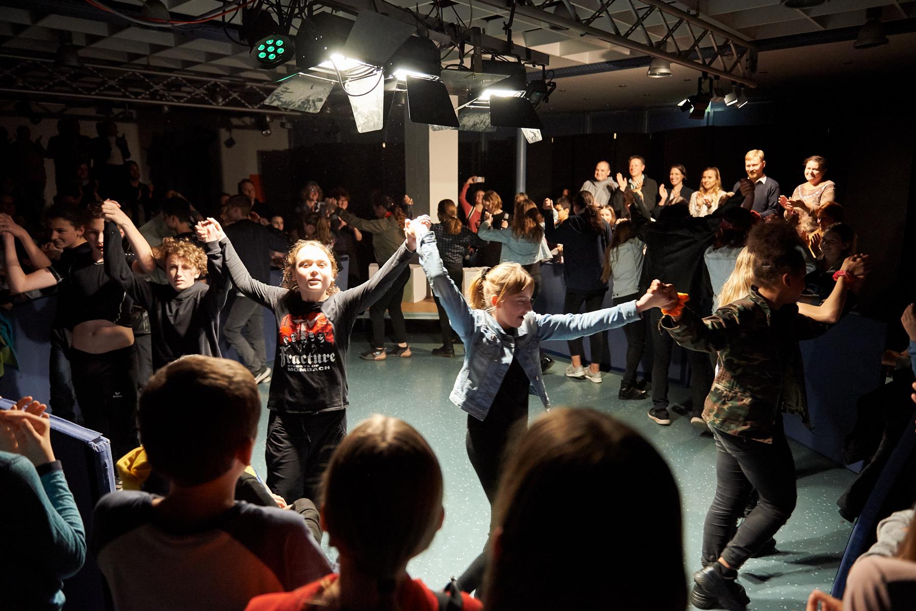 Unter der Anleitung der beiden Schauspielleiter Angela Grüter und Friedemann Lange musste das Publikum sogar mit vereinten Kräften die Bühne zu einer Kampfarena umbauen, in deren Scheinwerferlicht unter allgemeinem Jubel Ritter Delorges den gefährlichen Löwen wagemutig den Handschuh entriss. Zum krönenden Abschluss wurde Schillers „Handschuh“ unter stampfenden ACDC-Klängen zu einer, von einer wilden Rockergruppe viel umkämpften, „Handtäsch“ humoristisch umfunktioniert.